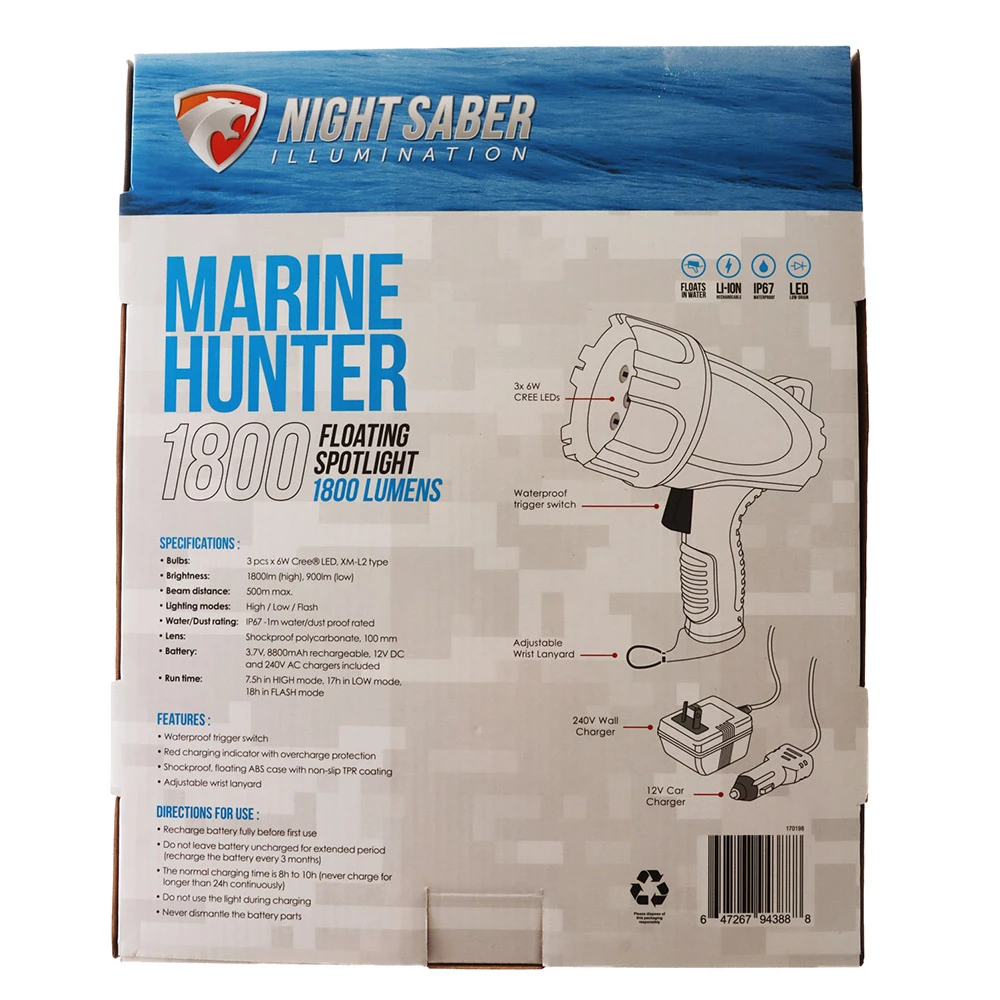 Night Saber Marine Hunter 1800 Lumen Waterproof Spotlight Features: